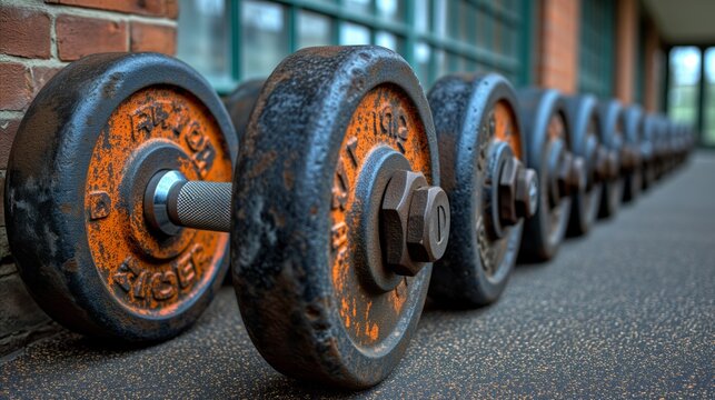 Row of rusty dumbbells on gym floor - fitness equipment close-up