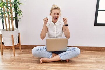 Young blonde woman using computer laptop sitting on the floor at the living room excited for success with arms raised and eyes closed celebrating victory smiling. winner concept.
