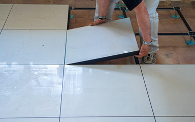 Worker install of raised floor in equipment room to spare space underground