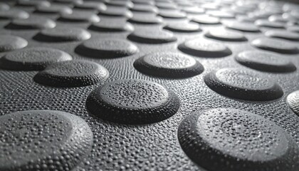 Close-up view of textured black rubber mat featuring raised circular patterns, ideal for flooring applications