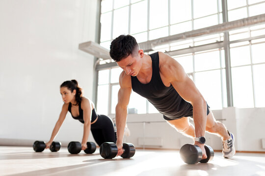 athletic couple in sportswear in training do push-ups with dumbbells in the fitness room in the morning