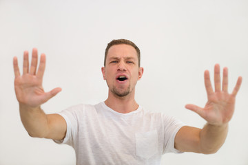 Portrait of calm adult man with beard raising his palms and looking at camera, standing over gray background. Guy suggests everyone to relax and breathe as team is under pressure.