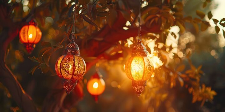 Orange Ramadan Lantern Hanging on Trees Muslim Holiday Decoration