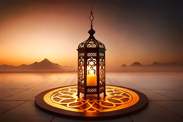 A beautiful background for Ramadan and Eid Al Fitr on a sea side, Lantern lamp with light in a colourful sky selective focus