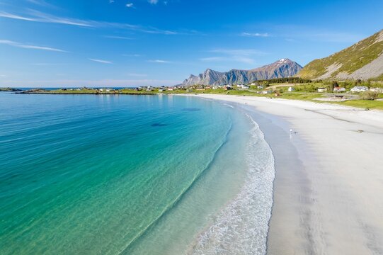 Ramberg Beach, Lofoten Islands, Norway with golden sand and azure sea