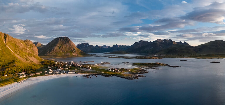 Aerial footage of Flakstad in Lofoten, Norway, during a sunny day with clouds