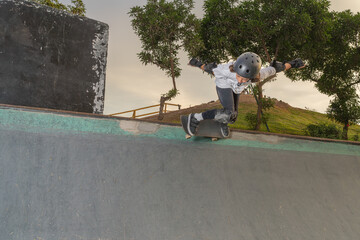Teenager practicing skateboard tricks on skate ramp
