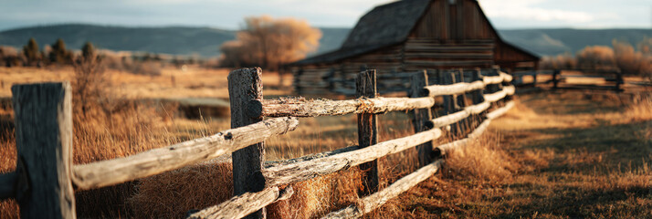 A weathered wooden fence borders a grassy field next to a rustic barn. In the background, hills rise under a partly cloudy sky, creating a serene ranch setting in the afternoon sun, banner