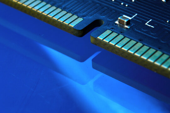 Computer memory RAM on circuit motherboard background . Close up. system, main memory, random access memory, onboard, computer detail. Computer components . DDR3. DDR4. DDR5
