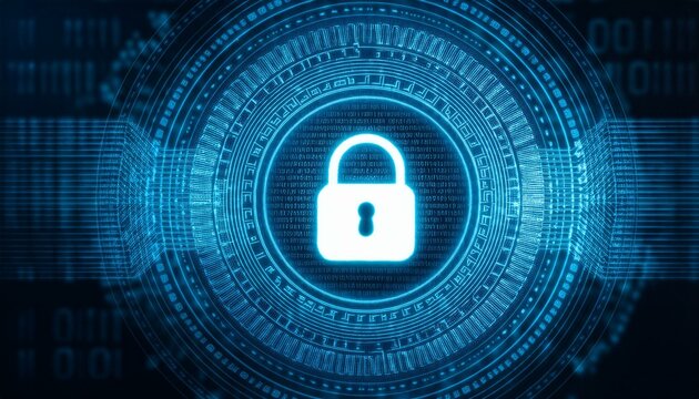 Digital security image with a glowing lock symbol on a background with precise patterns placed to represent encrypted codes