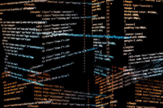 Random HTML codes in yellow and blue gradient overlay with black background.