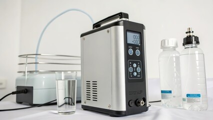 Close-up of laboratory glass test tubes with blue chemical solution and molecular structure background