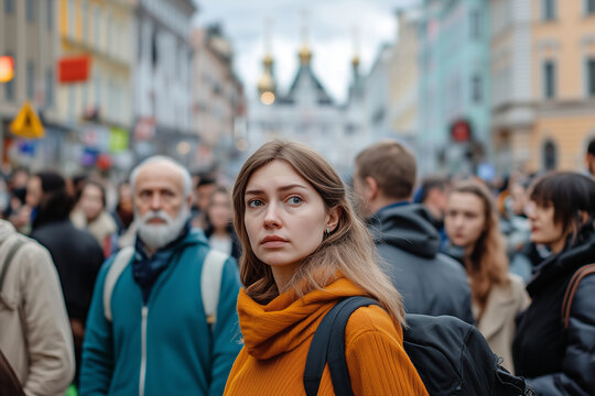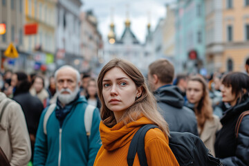 Annoyed pedestrian amidst the chaos of a busy crowd