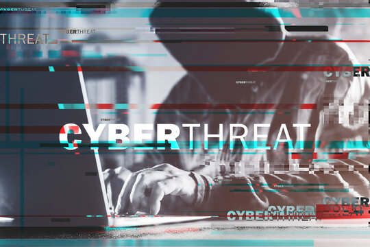 Hacker working with computer in dark room with digital interface around. Image with glitch effect.