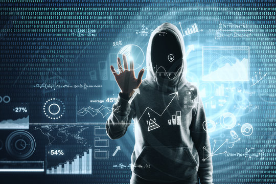 Hacker in hoodie with digital data interface on dark background.
