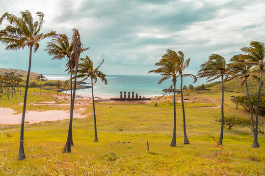 Palm Trees on Anakena Beach with the silhouette of the Moai of Ahu Nao Nao archaeological site, Rapa Nui (Easter Island), Chile.