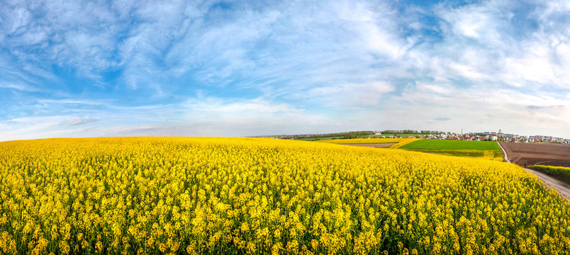 Oilseed rape, rapeseed field flowering in farmland  in countryside , spring landscape under blue sky on sunny day in springtime, nature background