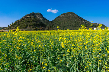 Yellow rapeseed flowers Field with blue sky at Luoping County, China