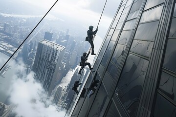 Scaling glass skyscraper at twilight in black tactical bodysuit holding rope harness