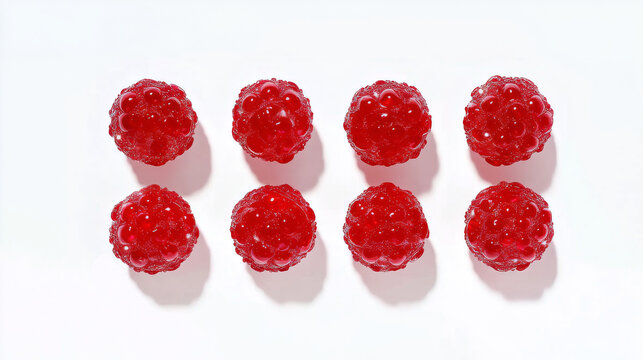 Top-down shot of colorful raspberry-shaped jelly fruit snacks, assorted flavors, isolated white background, studio lighting, ideal for advertising