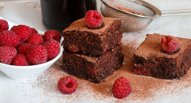 Chocolate brownie with raspberries and dark beer. Selective focus