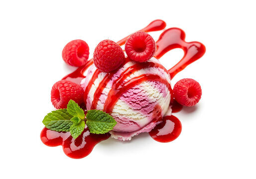 Delicious scoop of raspberry swirl ice cream with fresh berries and mint