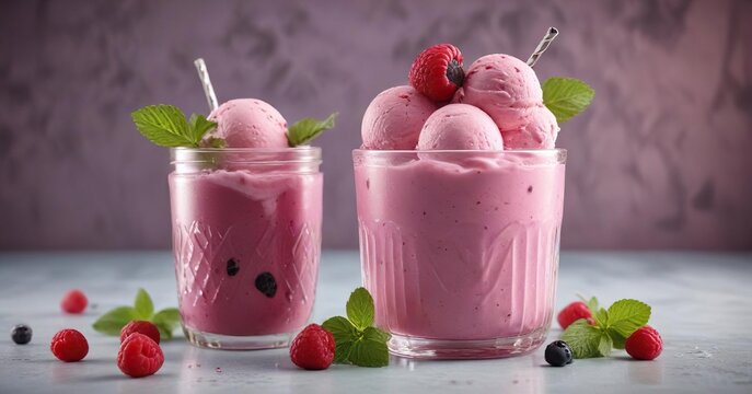 Refreshing raspberry ice cream served in bowls with fresh berries and mint leaves on a clean white background