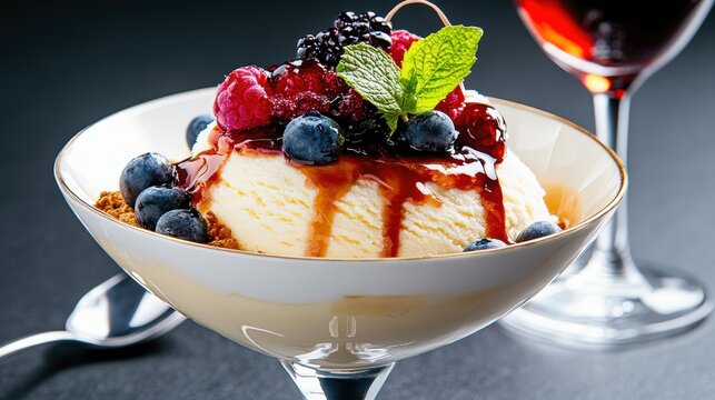 Bowl of berry ice cream with fresh berries and mint. Refreshing and seasonal