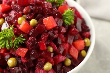 Fresh homemade beet salad vinaigrette in a wooden bowl. Traditional Russian food.