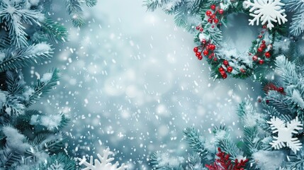 Christmas wreath and snowflakes on holiday background with blank space Raster image