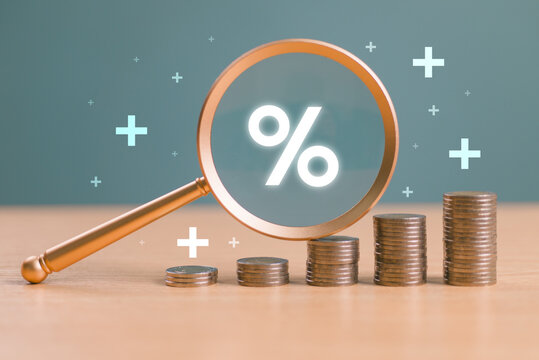 Interest on stacks of US dollars on a wooden table with an arrow pointing up. Finance and Mortgage Interest Rate Ideas wooden block with percentage icon and arrow pointing up the economy is improving