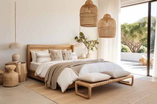 Living room in nordic minimalist bohemian style. Rattan chandelier, white sofa and small table. Generative AI