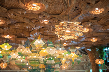 Many lamps of rattan, hay hang from the ceiling. Traditional and simple lighting.