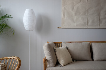 White and bright bedroom interior with wicker peacock chair and rattan lamp
