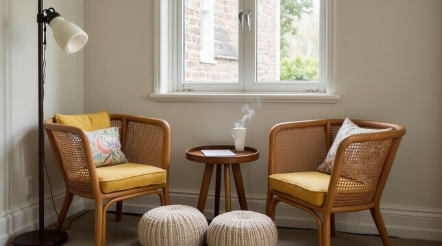 Corner nook with paired rattan chairs, floor lamp, foot poufs