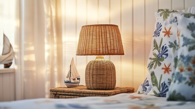 A small rattan table lamp with a woven shade on a coastal-style nightstand surrounded by nautical-themed decor in a breezy well-lit bedroom