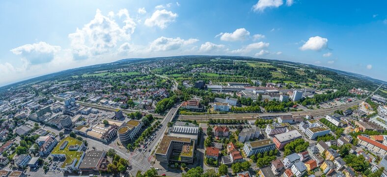 Aerial view around the old town of the city Weingarten, Ravensburg in Germany on am overcast afternoon in summer.