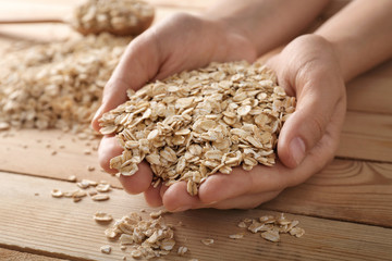 Female hands with oatmeal flakes on wooden background, closeup