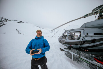 Drone operator looks up while flying drone next to helicopter