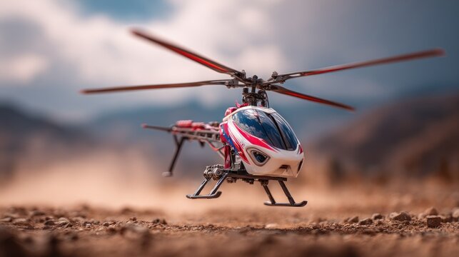 Dynamic close-up shot of a toy helicopter taking off in a rugged environment