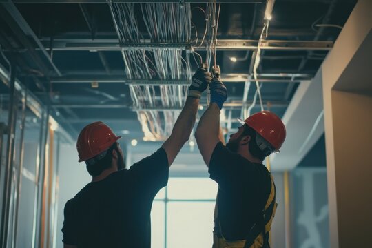 Two Construction Workers Installing Electrical Wiring in a Ceiling
