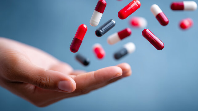 hand reaching for a capsule pill on a blue background with blurred pills flying around. close-up of a hand and scattered round red, white, and dark grey gelatin sci-fi style capsul