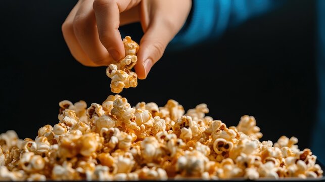 Hand reaches for caramel popcorn in a cozy setting with a mound of delicious treats ready to be enjoyed. National Caramel Popcorn Day
