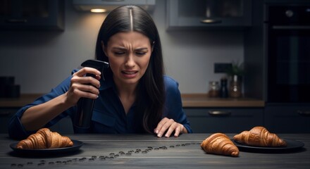 Young woman reacts with disgust to an ant infestation on a kitchen counter near food.