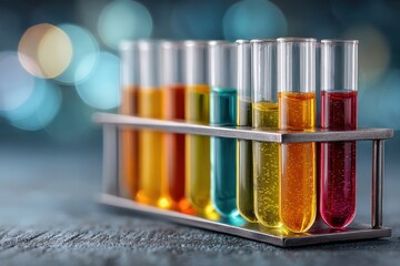 Colorful Science Lab Beakers with Bubbles and Reflections, Laboratory Research Equipment with Cork Stoppers and Brightly Colored Liquids