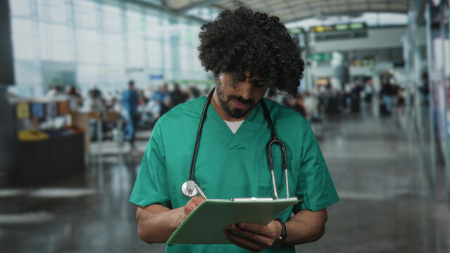 Man doctor with curly hair in green scrubs and stethoscope writing on clipboard holding pen in airport terminal; medical duty concern.