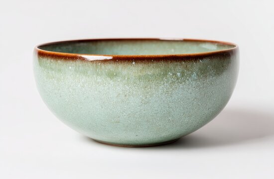 A wide, shallow, seafoam-green ceramic bowl with a dark-brown rim, displaying a speckled, reactive glaze effect against a bright white background