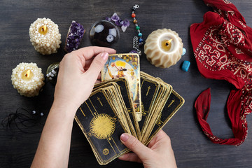 Fortune teller female hands and tarot cards on dark wooden table. Divination concept.