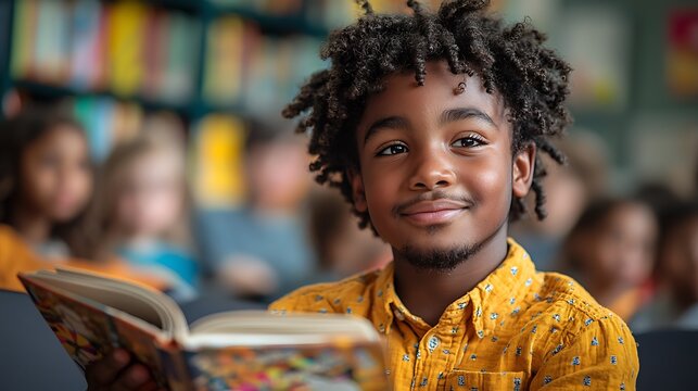 Young boy enjoying reading in classroom with graphic overlay