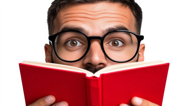Enthralled Reader: A close-up portrait of a man wearing glasses, his eyes wide with fascination as he reads a book. A captivating depiction of the joy of reading.